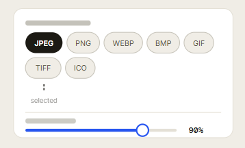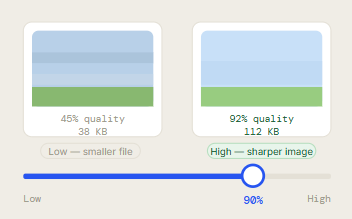 For JPEG and WEBP output, the quality slider controls the balance between file size and sharpness. A setting of 85–92% is ideal for most photos — noticeably smaller files with no visible quality difference. For PNG, TIFF, BMP, and ICO the slider has no effect since those formats are lossless.