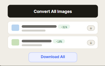 Click Convert All Images. Each file is processed and a result row appears showing a thumbnail, the output dimensions, the new file size, and a green badge when the file is smaller than the original. Download files individually or click Download All to save the entire batch at once.